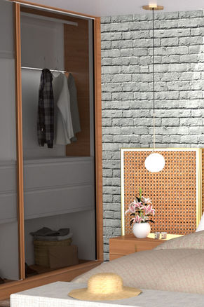 Conseguimos trazer em 13,50m² uma cama confortável, um roupeiro em L que conta com um espaço de home office (Veja as postagens anteriores), com muito estilo.