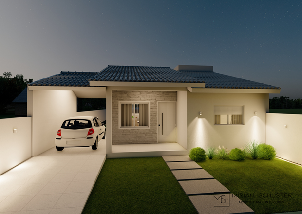 A iluminação indireta na fachada, evidencia a casa, no período noturno.